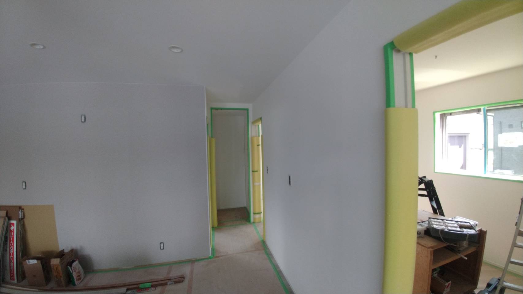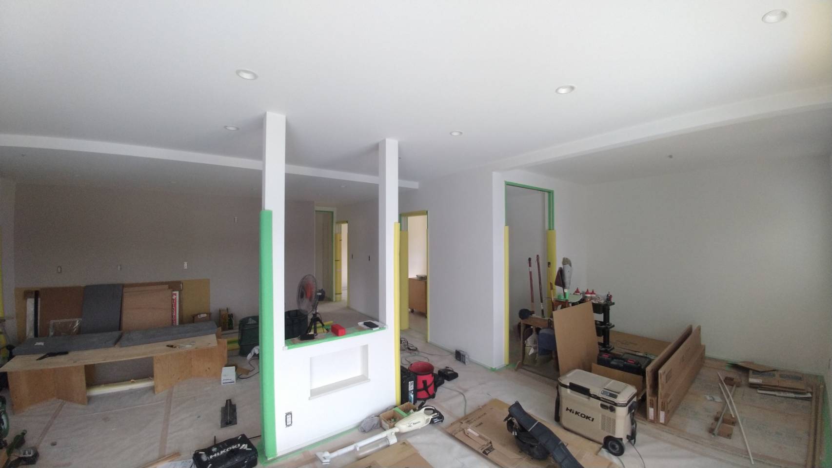 内部工事が進むY様邸。耐火性に富むプラスターボードの取付作業中です。この後は、壁紙工事・キッチン等住設機器の設置工事へバトンを渡していきます。