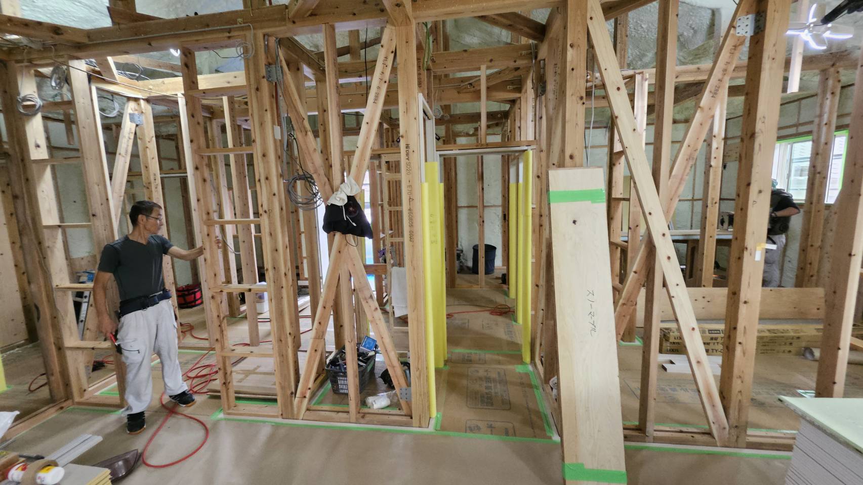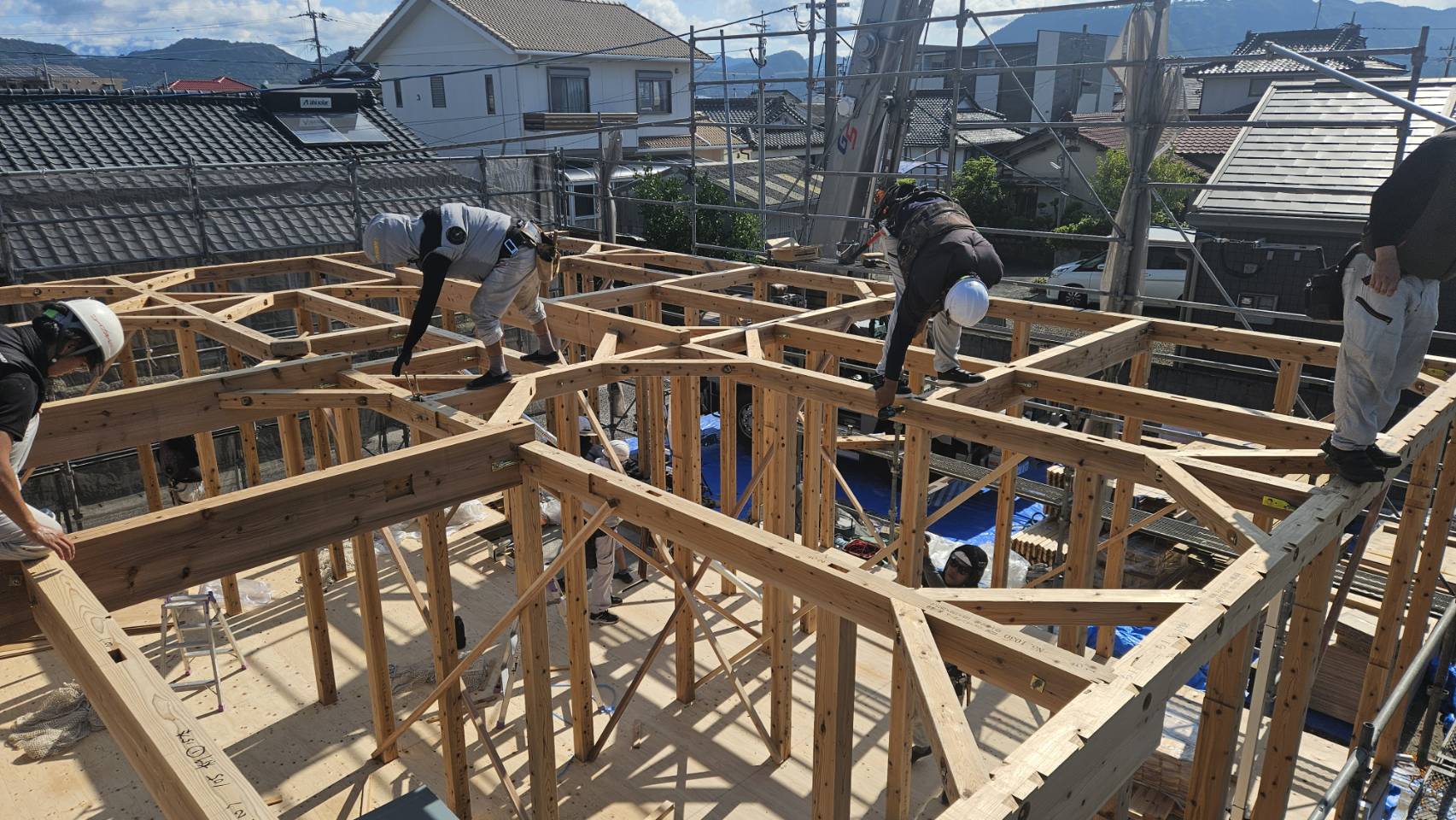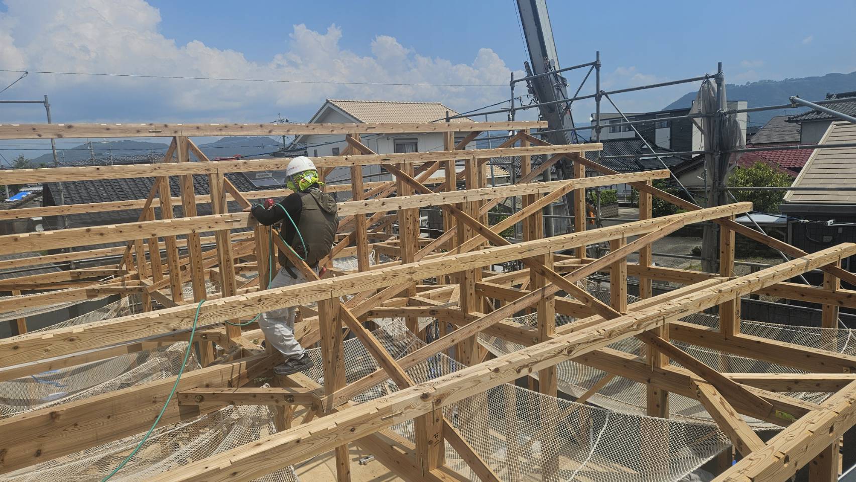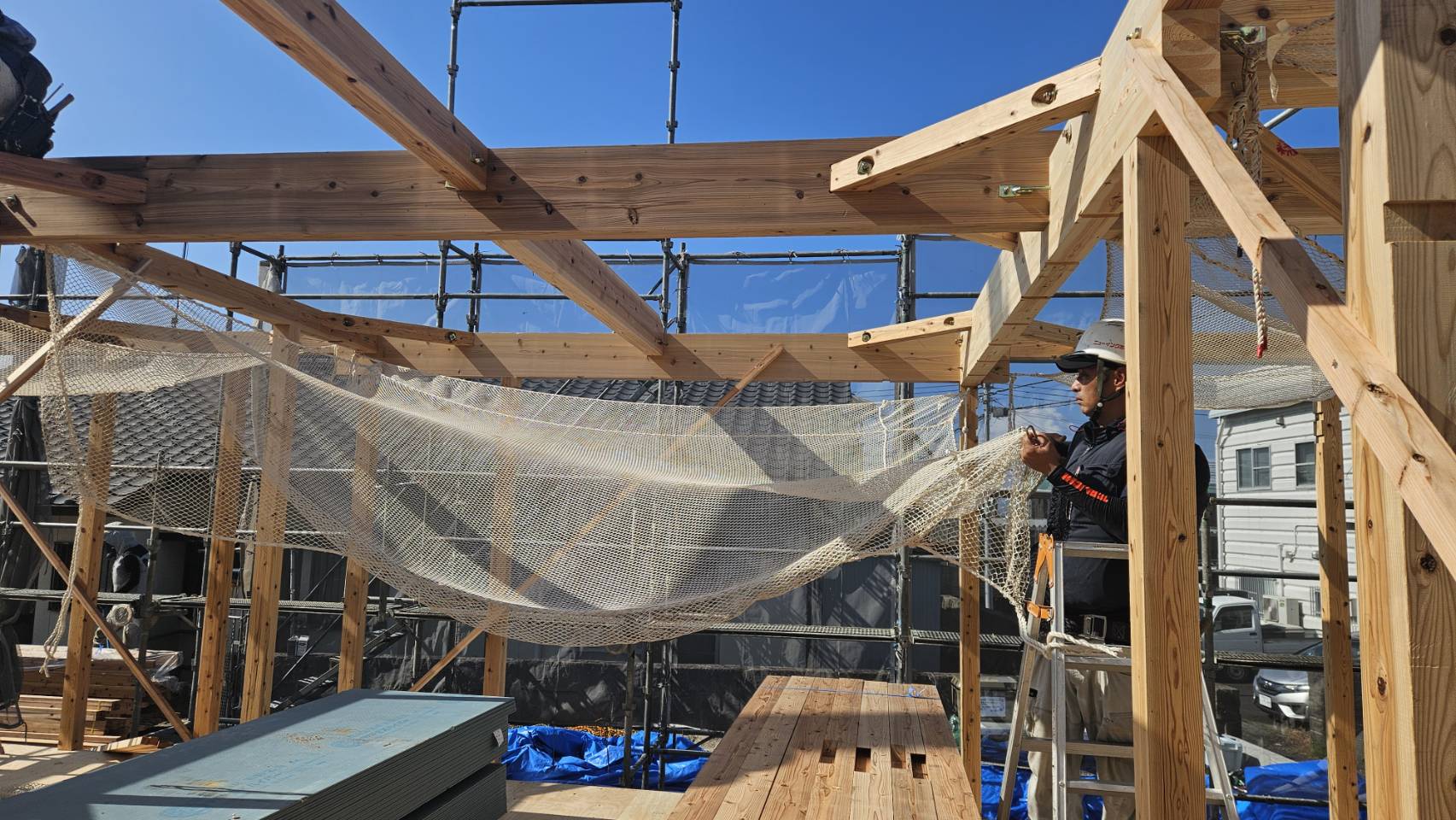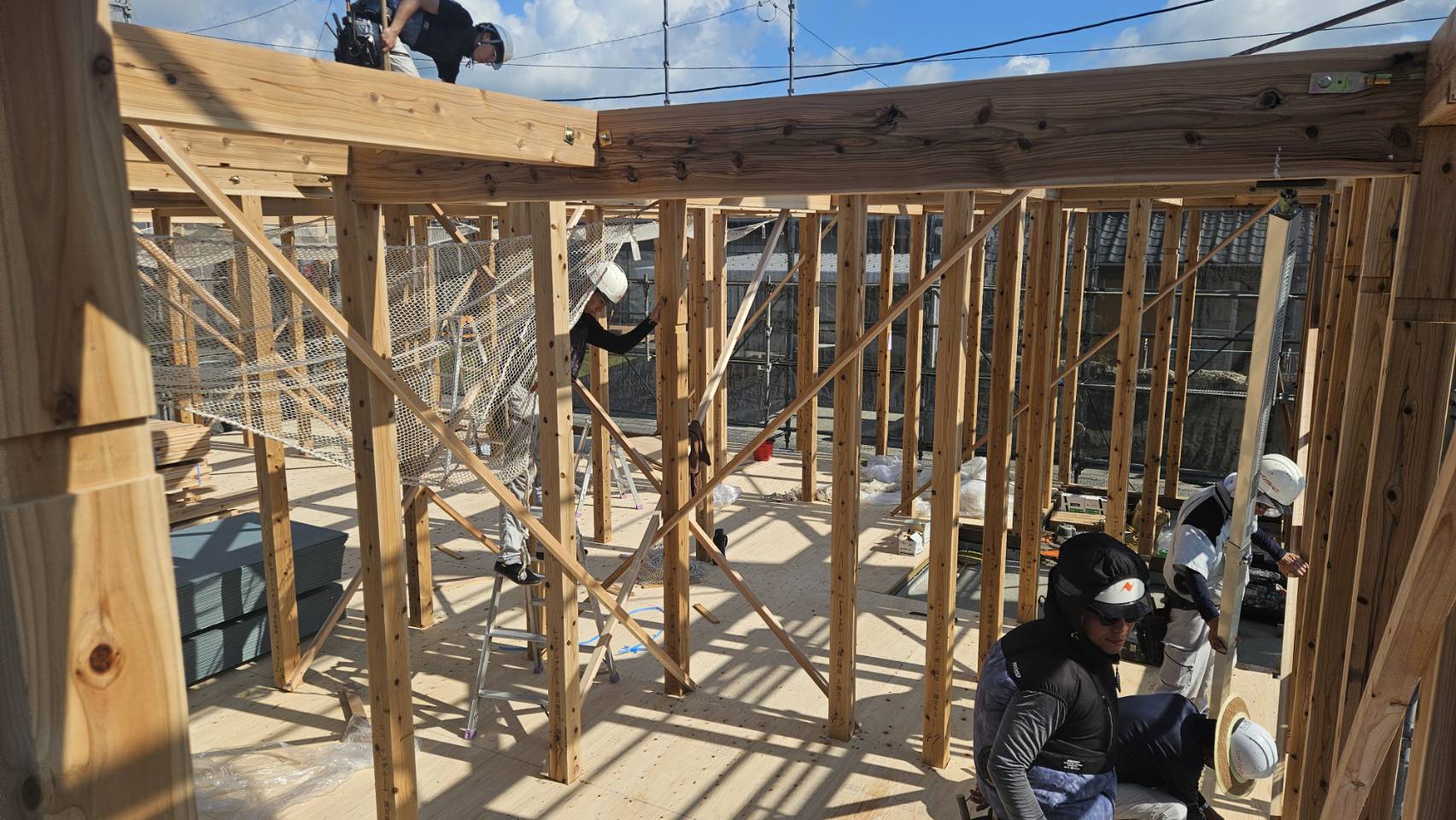 梁や大引きを複数人でかけるときのタイミング合わせや、クレーンとの合図作業。