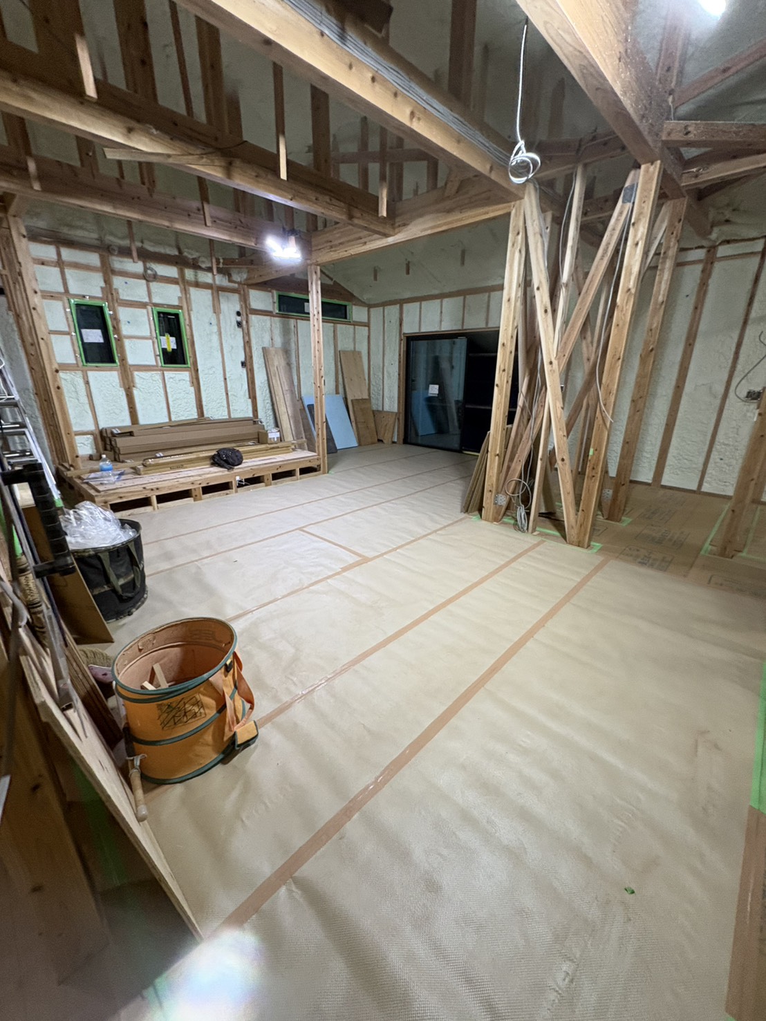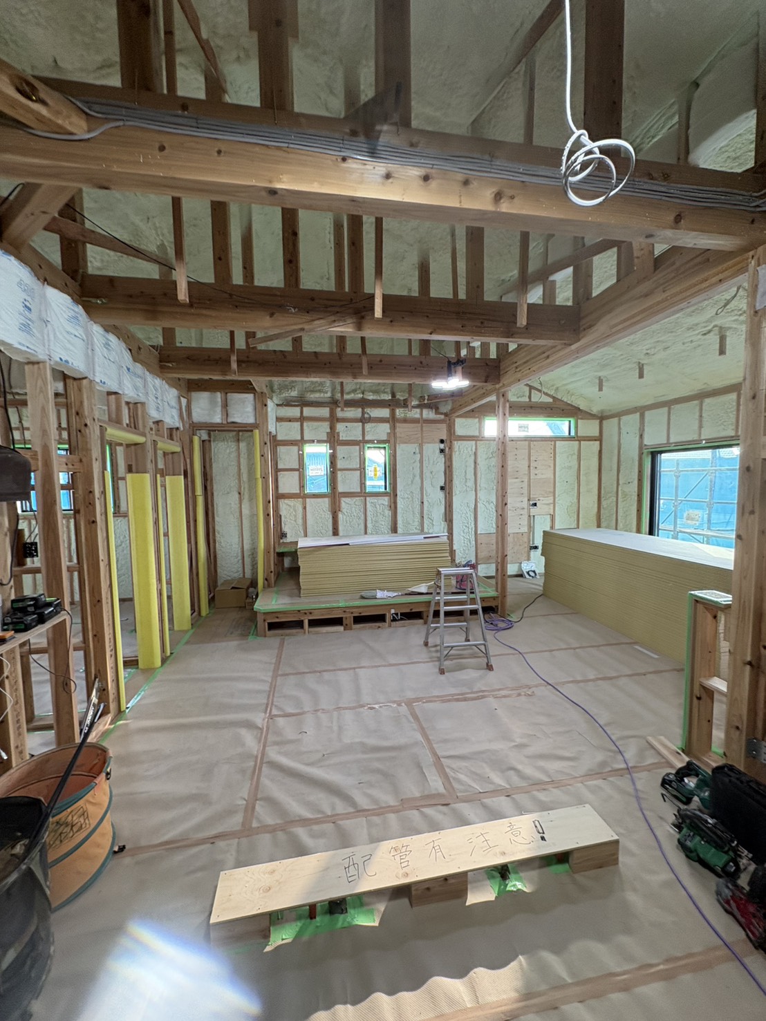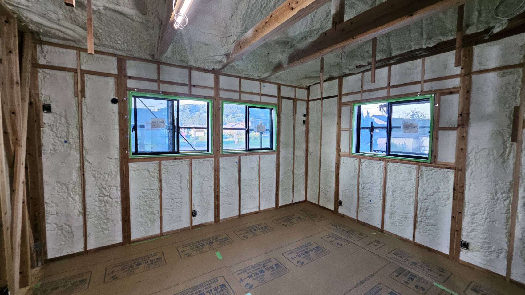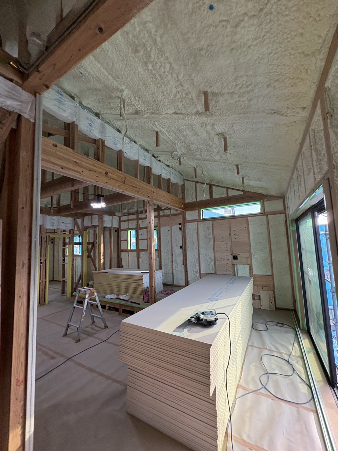 M様邸、吹き付け断熱の作業が完了いたしました。