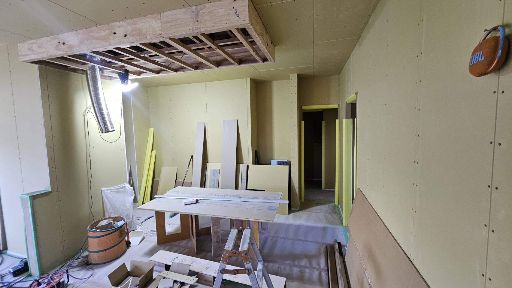 最近は夕暮れの時間帯が早くなり、天井に仮つけしたライトの元