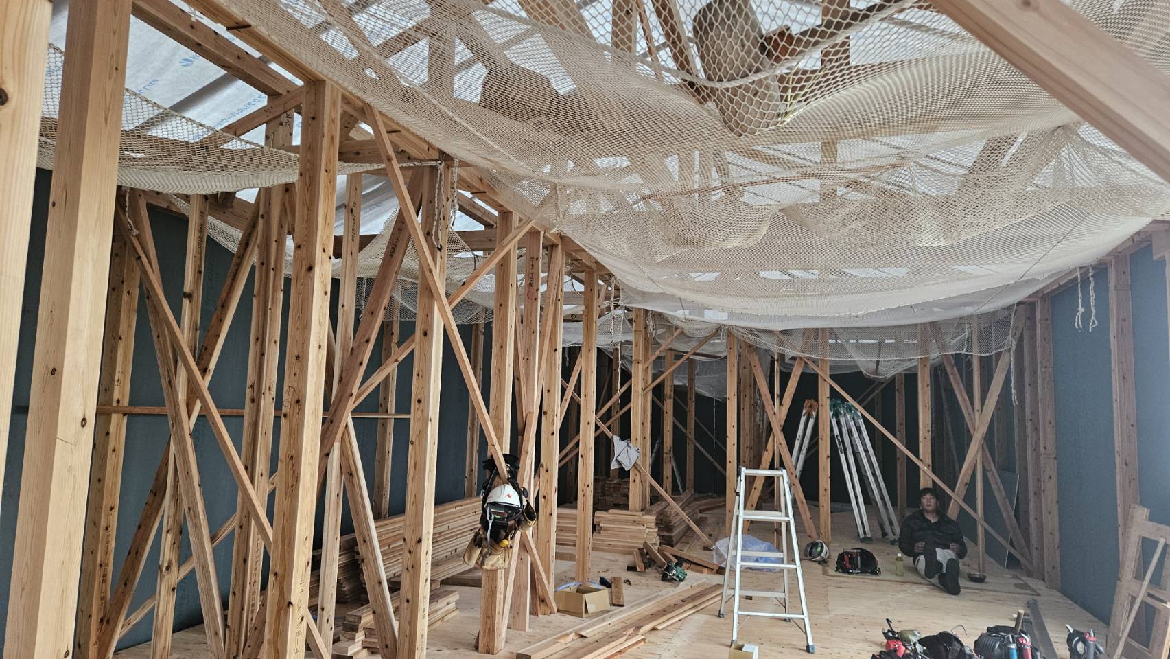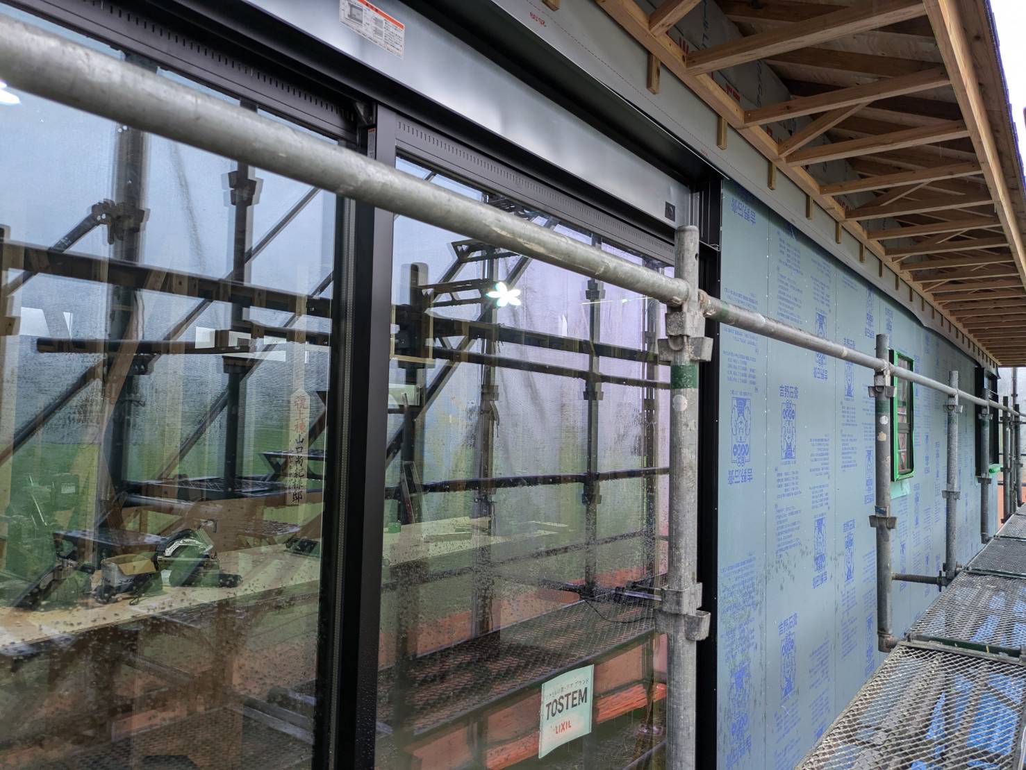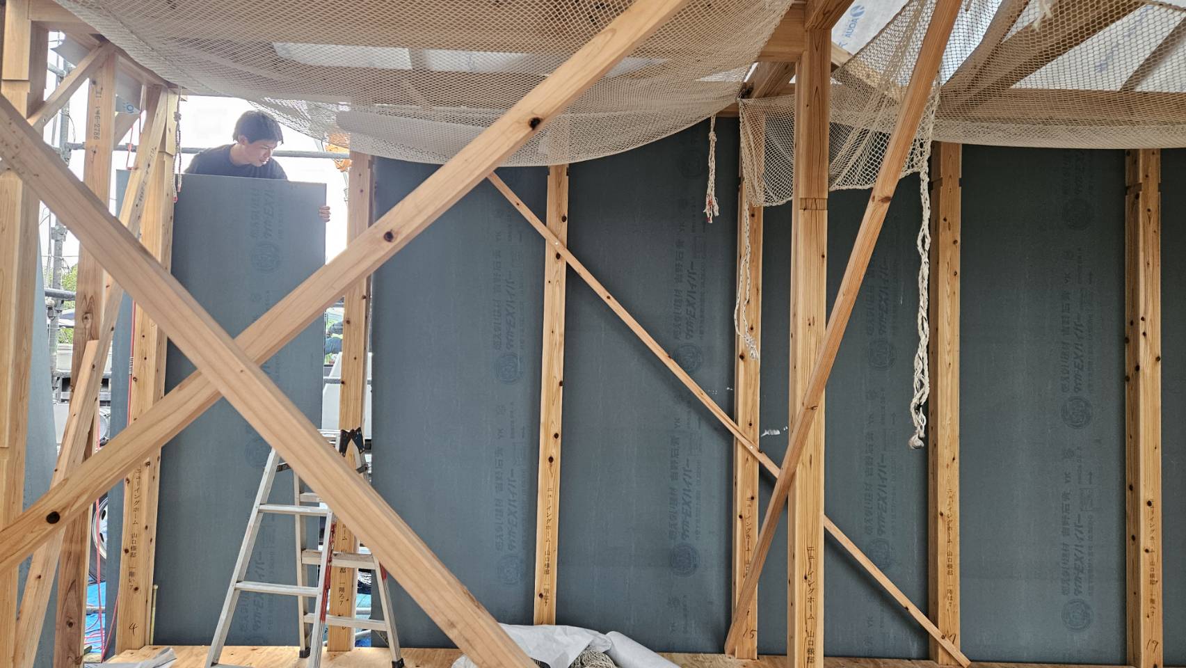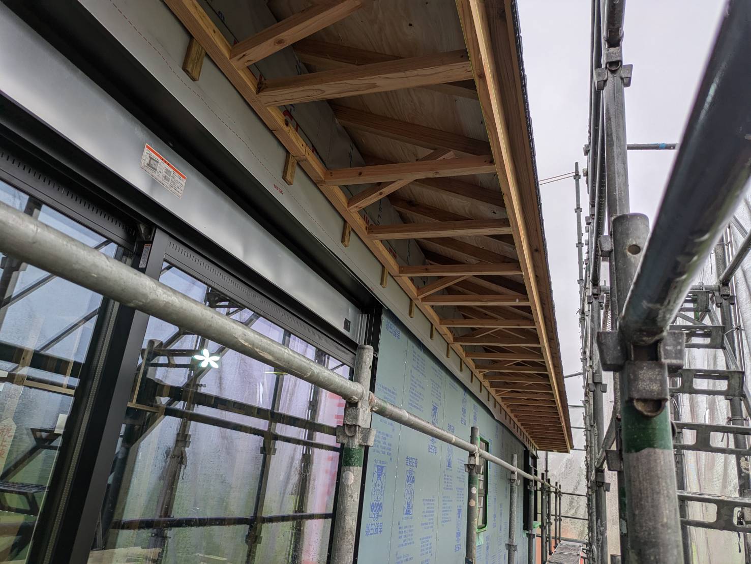 Y様邸、外壁の透湿防水シート施工完了し、軒天作業に取り掛かっています。