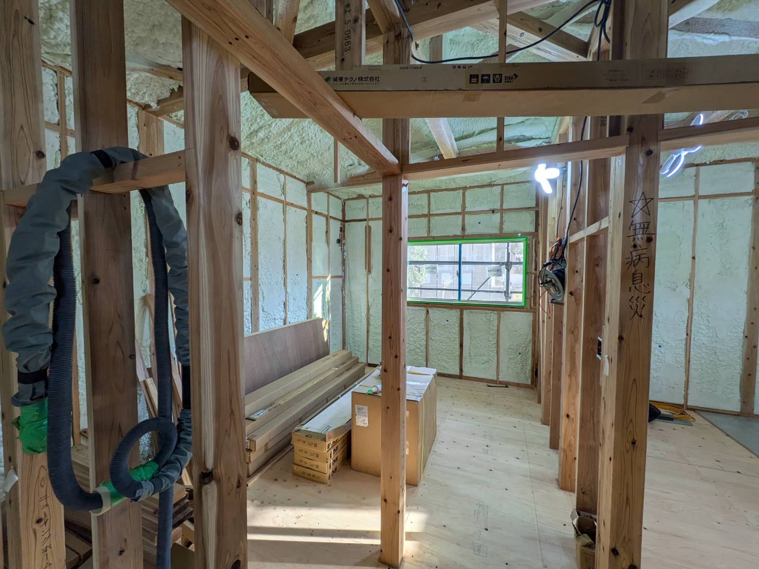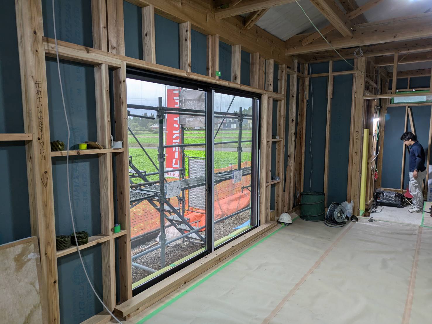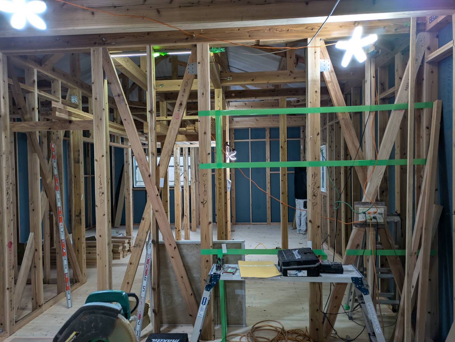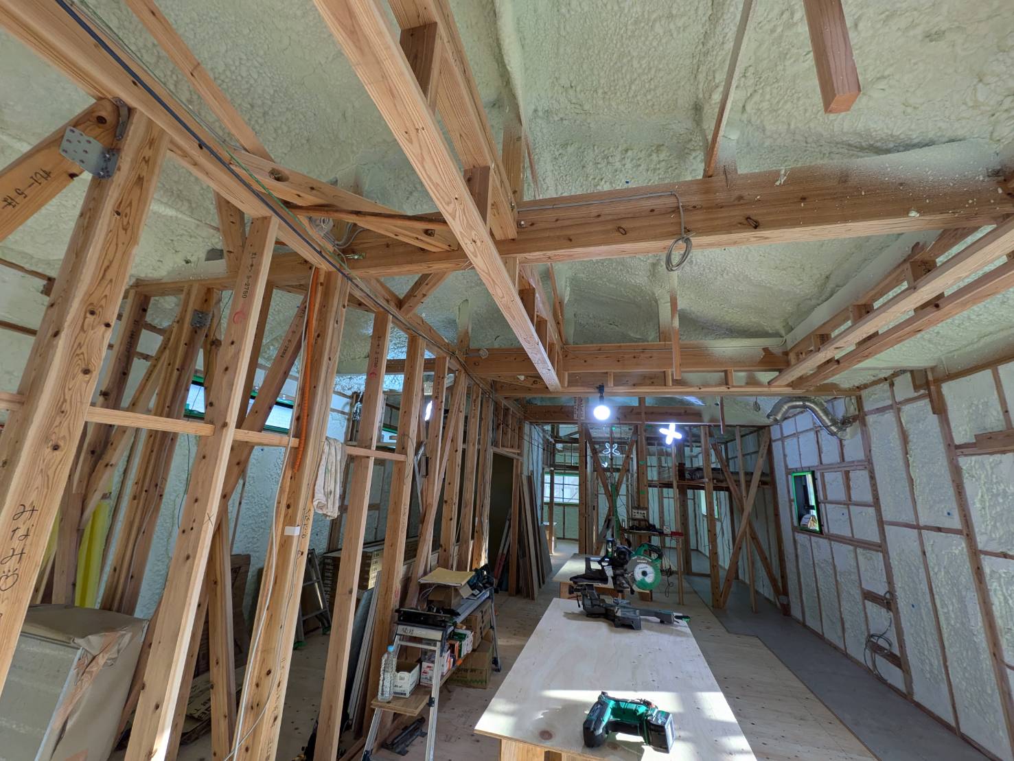 Y様邸、外壁の透湿防水シート施工完了し、軒天作業に取り掛かっています。