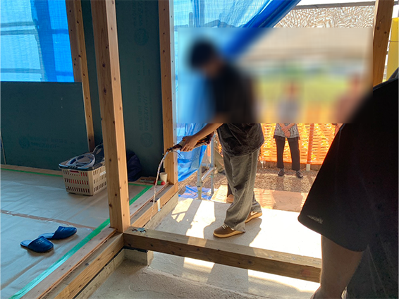 透湿防水シートの施工では、シートの重ね代とテープ処理をしっかり確認します。