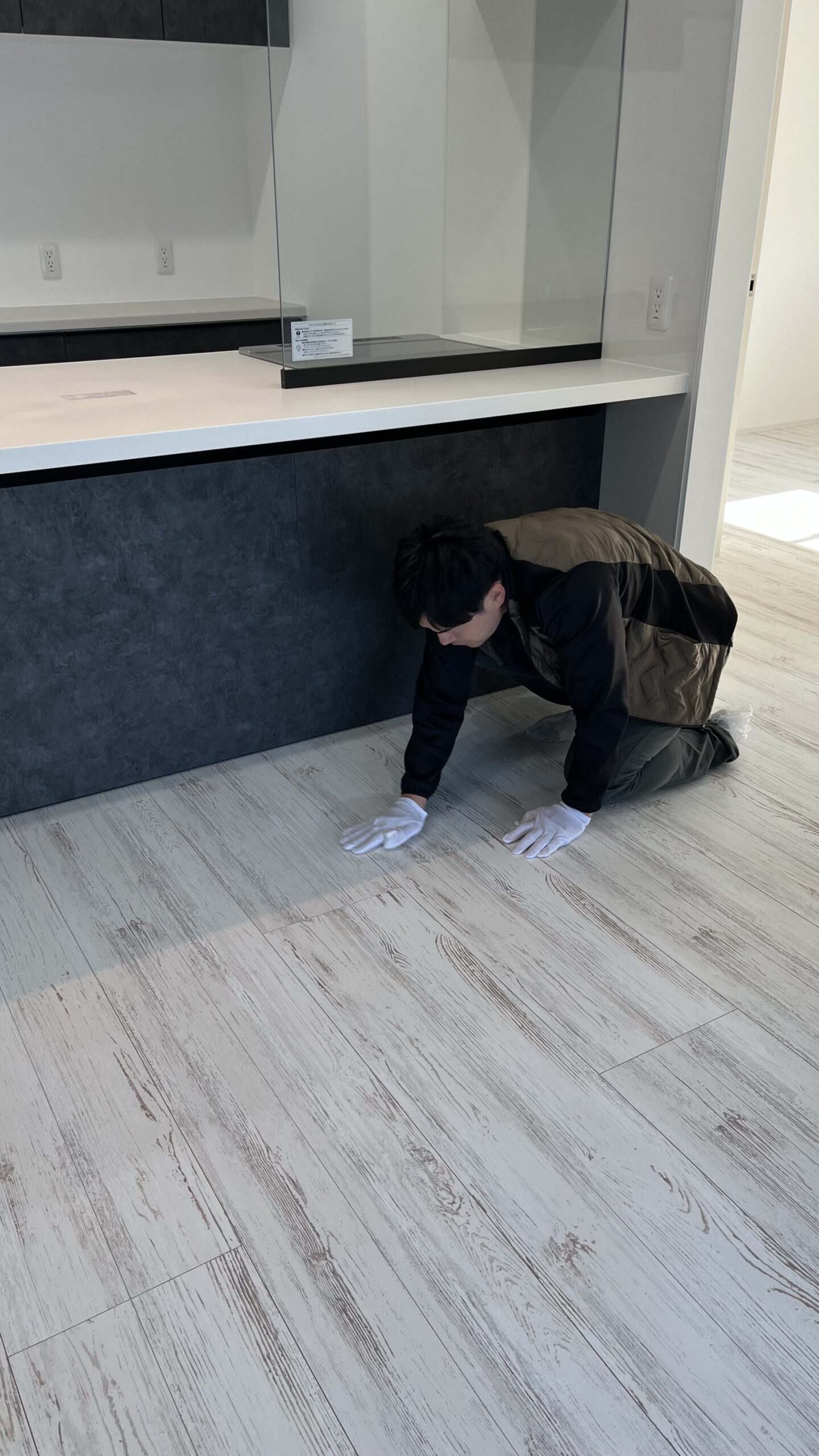 フローリング材に、柱の位置ごとカットを入れながら今回もきっちり施工することができました。