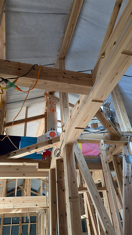 見上げると、上棟札が高い位置から見守ってくれているようです。
