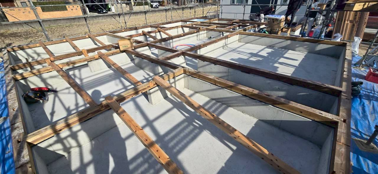 基礎工事の後、土台敷きを終えて、柱を立てていきます。