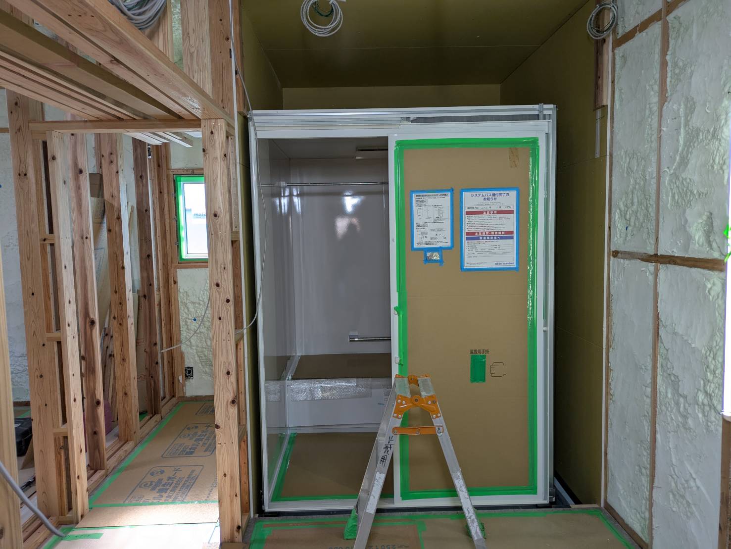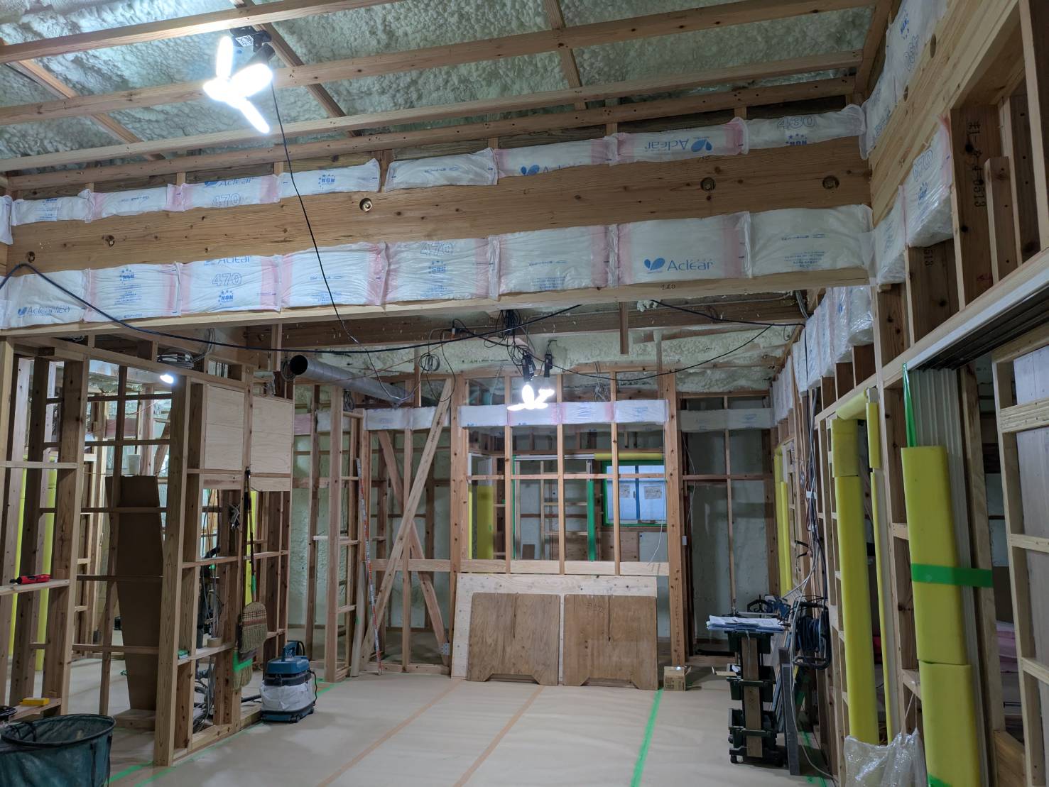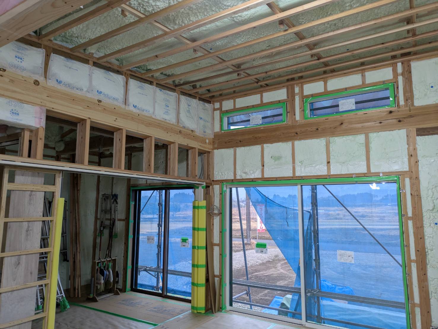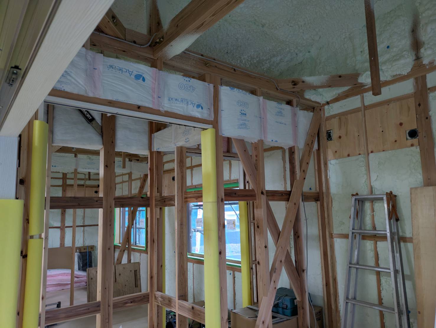 計算が欠かせません。天井部の吹き付け断熱も完了し、次は壁部分への断熱施工となります。