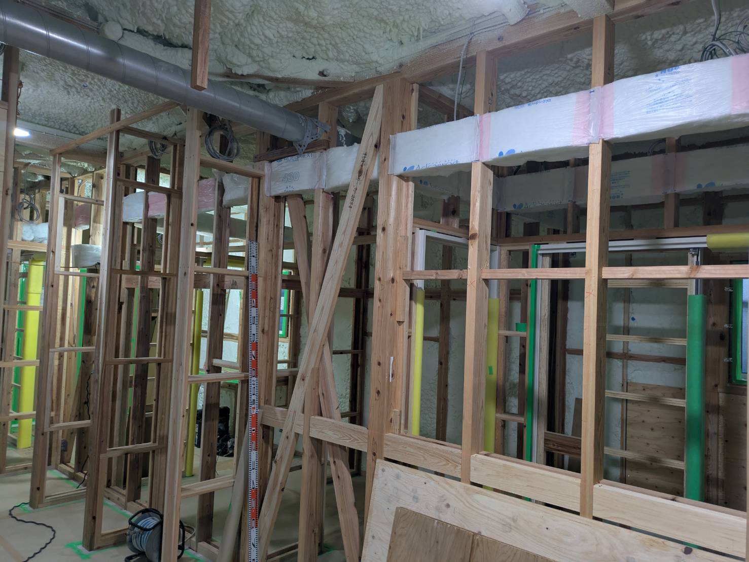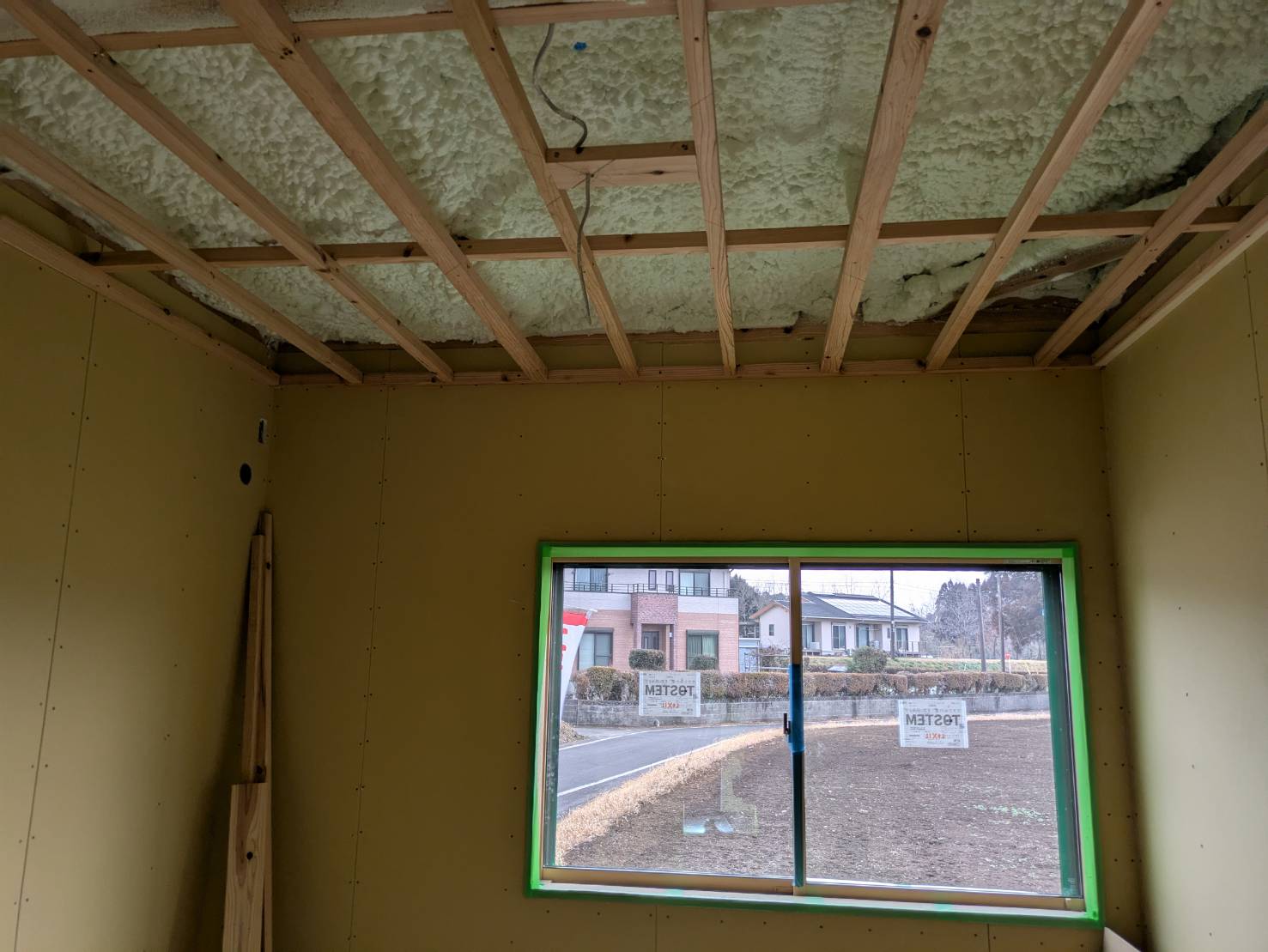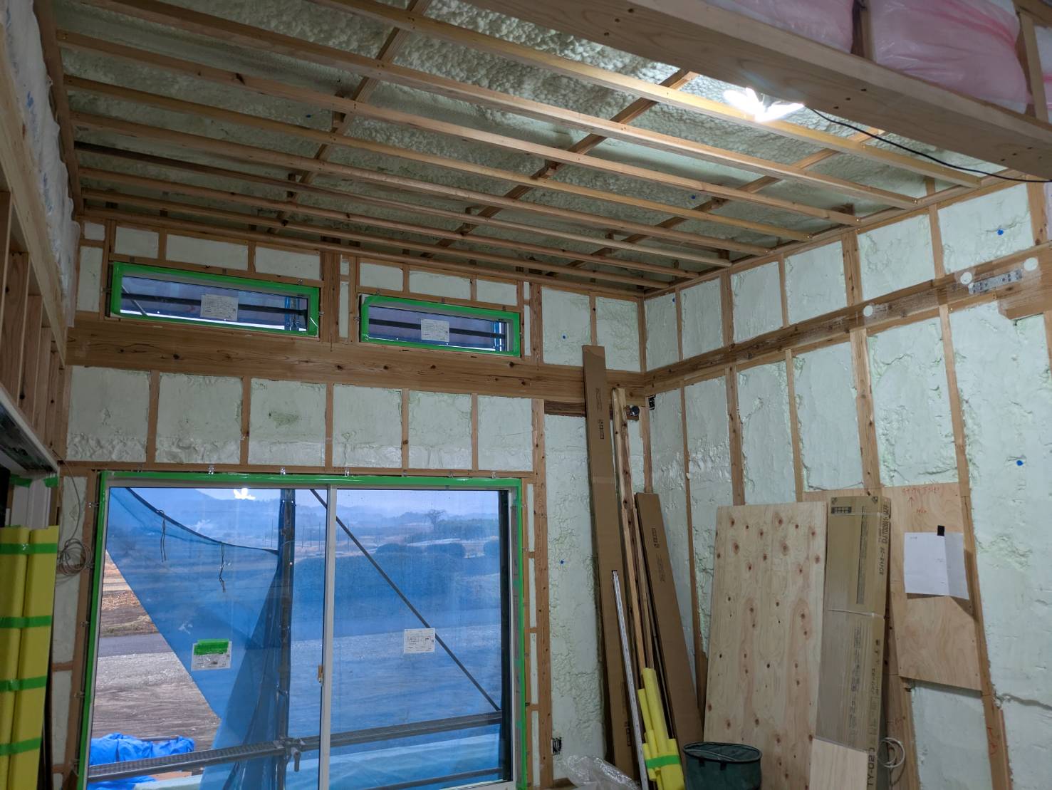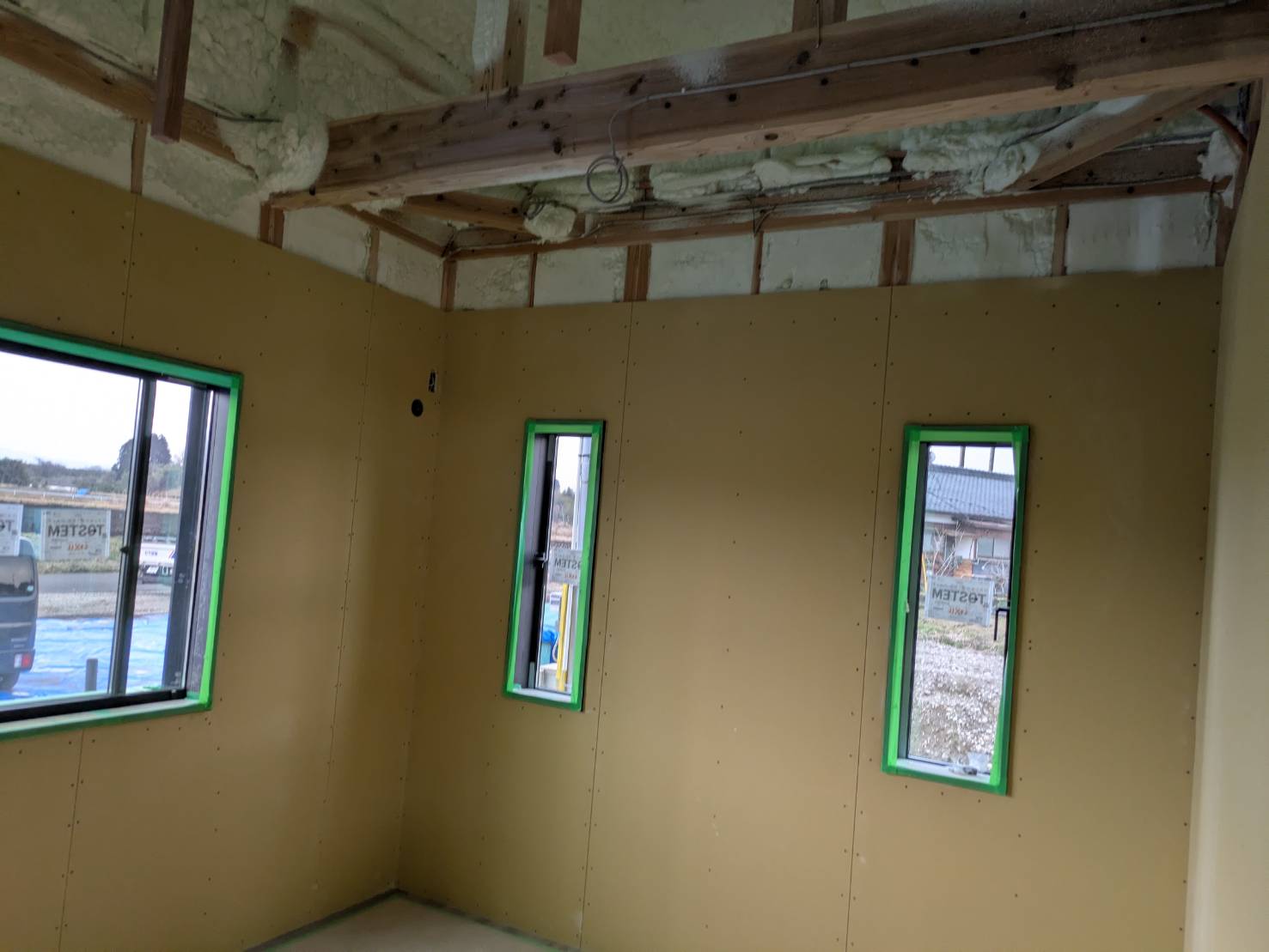T様邸、壁部分の吹き付け断熱及び、石膏ボード貼りが完了しております。