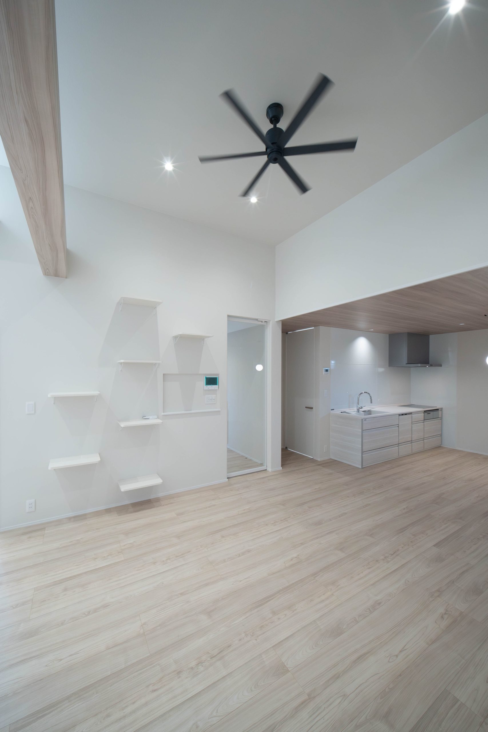 天井を上げ解放感バツグンのリビング。「見せ梁」を「キャットウォーク梁」として利用。南面の壁にステップを設けて、明り取り窓際へ猫ちゃんたちの特等席をご用意。