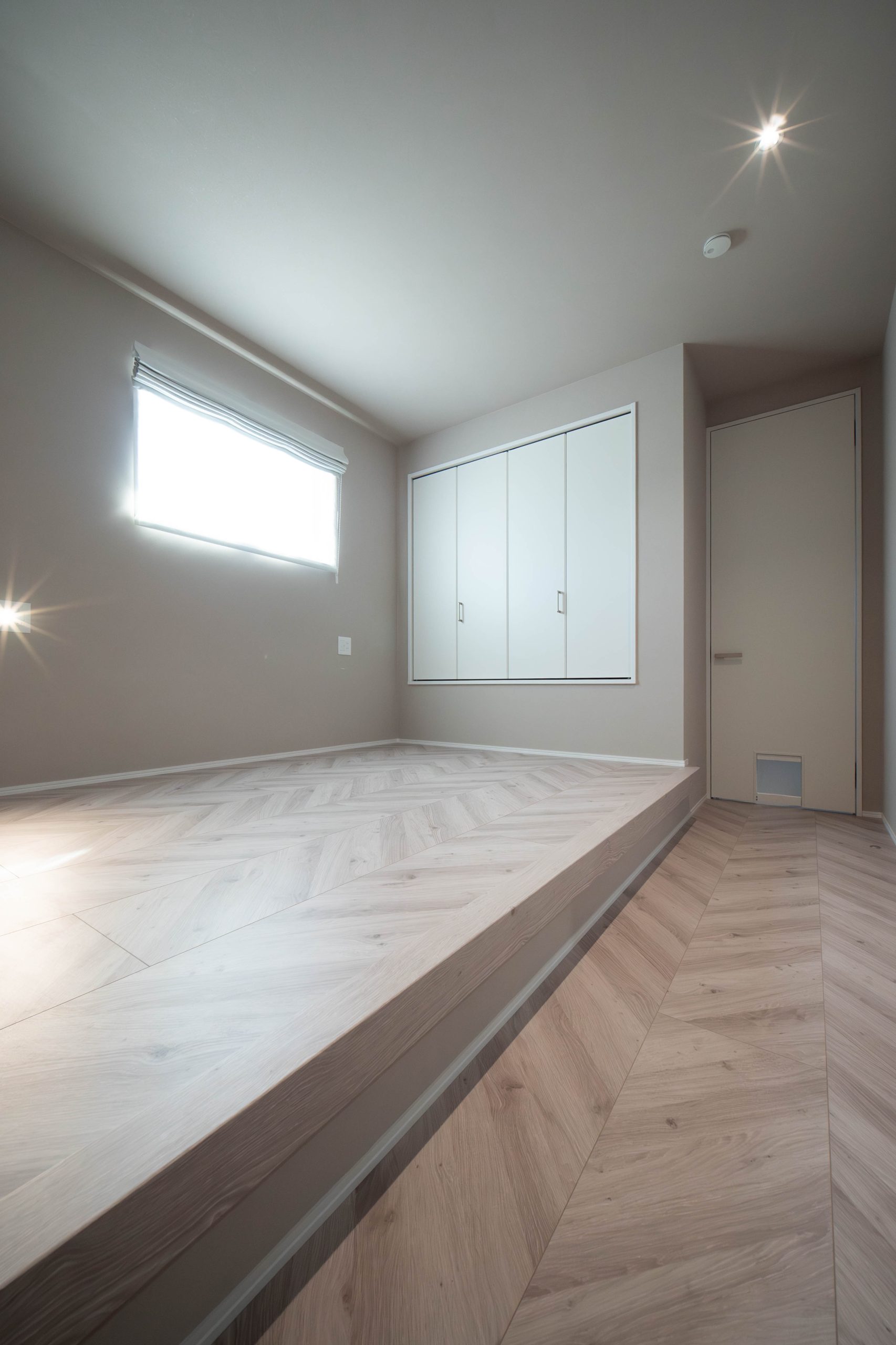 ベッドフレームを置かなくてもいいように、小上がりとした寝室。入口ドアはペットドアを採用。ドアを閉めたままでも猫ちゃん達は自由に行ったり来たりできます。