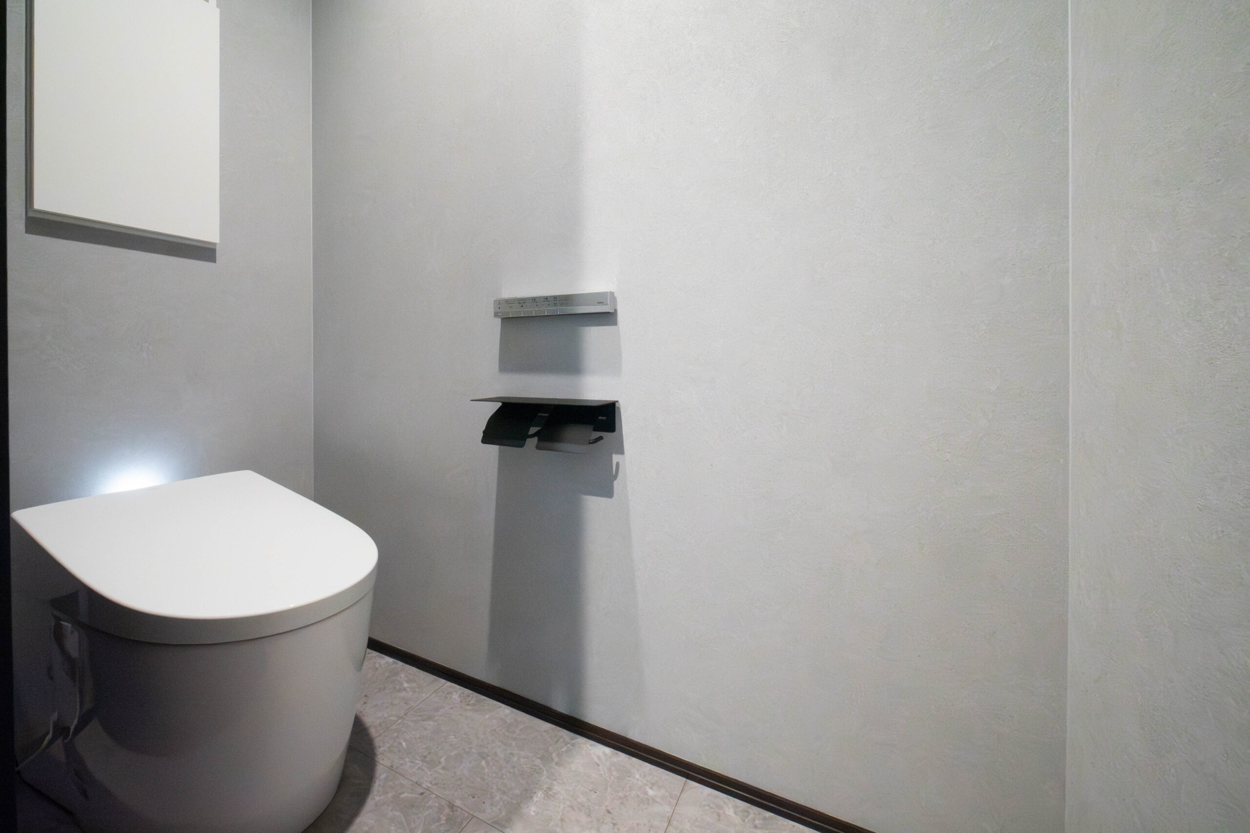一人になれる場所も大切と「あ~でもない」「こ~でもない」と悩まれた奥様の出した答えは高機能&シンプル&スタイリッシュ!落ち着いた空間と高機能便器が至高の時間をおもてなし。