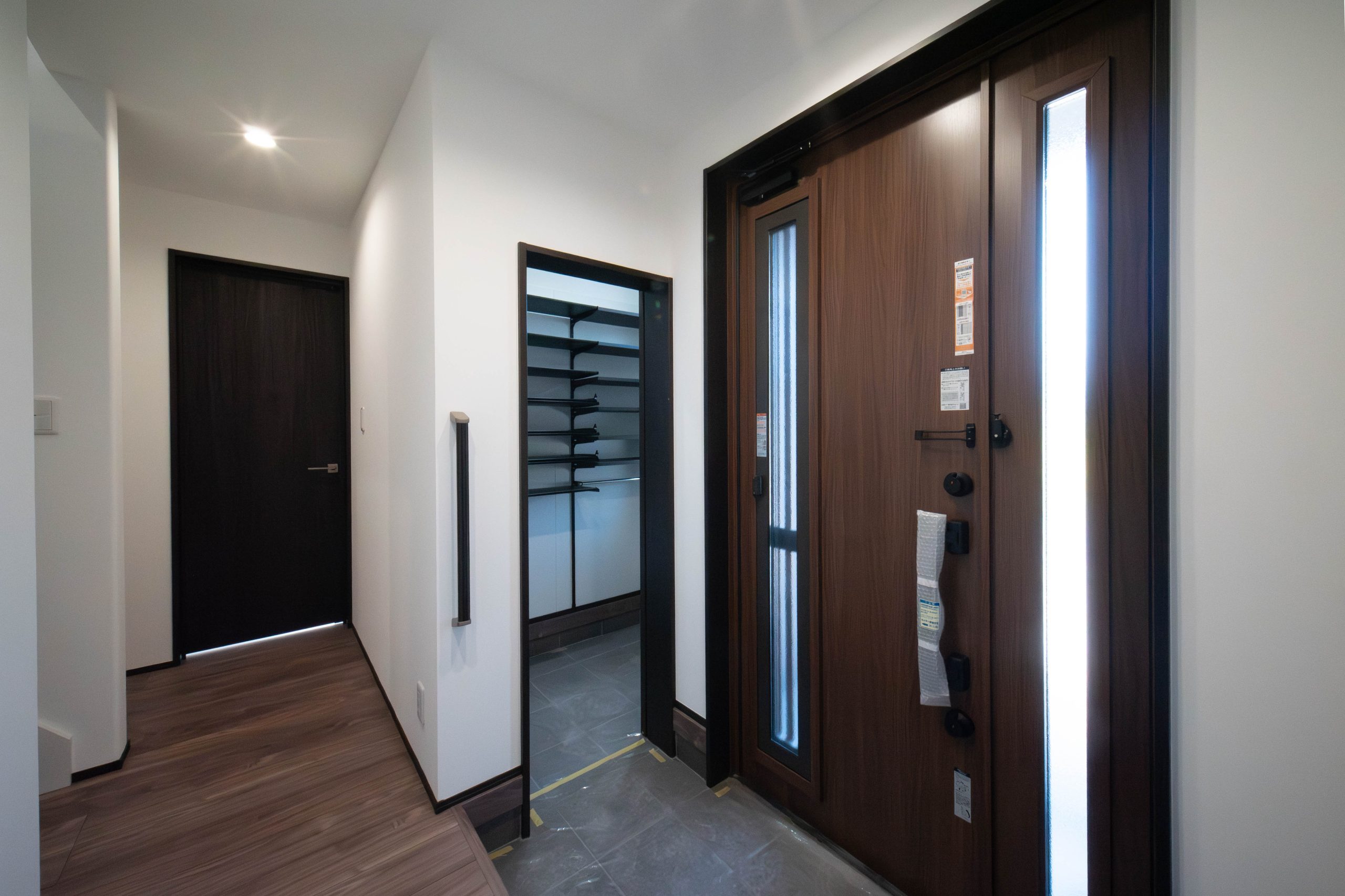 玄関入って右側にはシューズクローク。かさばりがちな家族の靴や傘、ちょっとしたアウトドアグッズやご主人のゴルフセットも収納可能な大容量を確保!