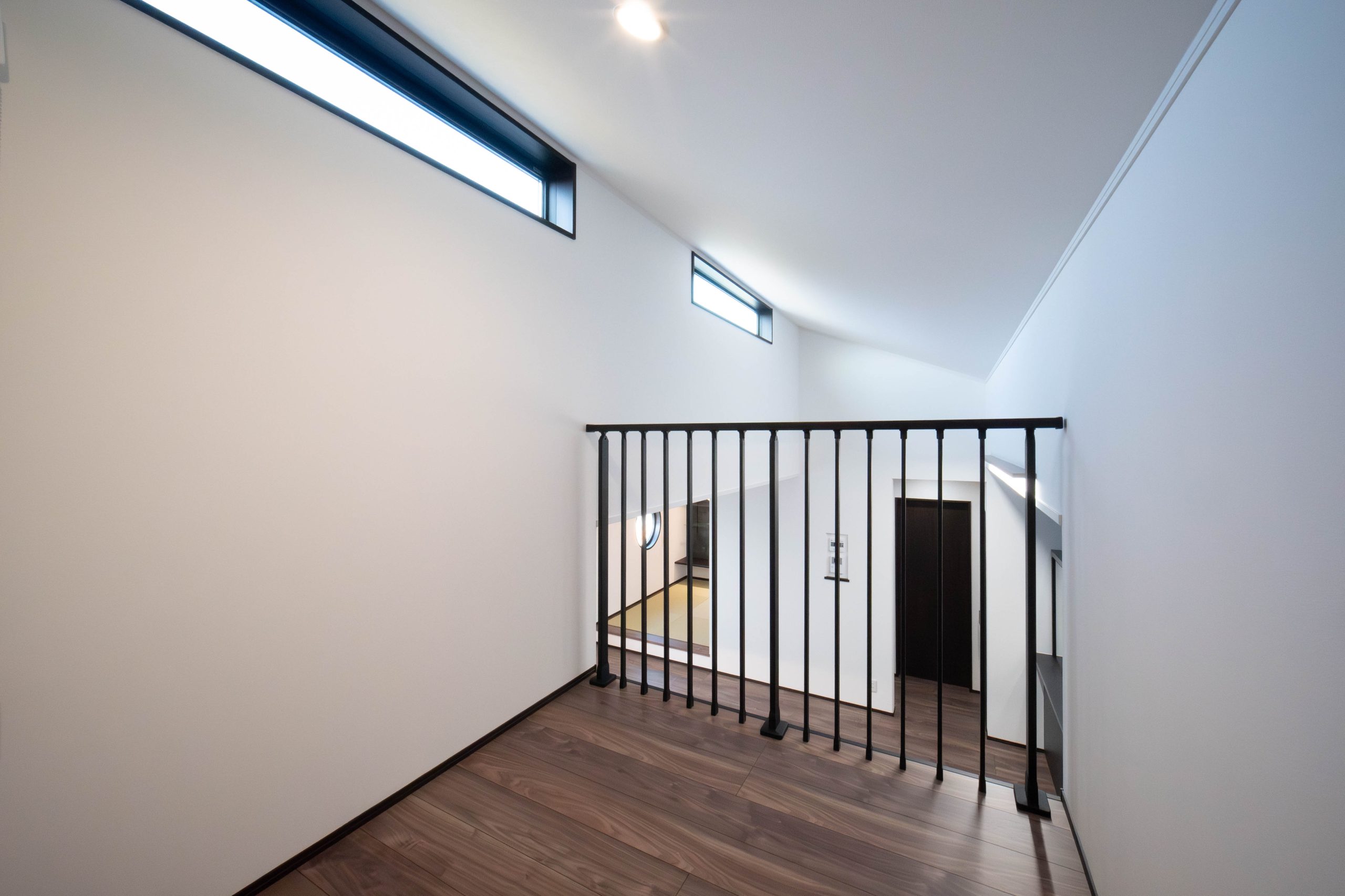 玄関前の階段を上がりきった先にある2畳のロフト。掛け違い屋根の部分から明るい光が差し込み、LDKも見下ろせる特別な空間となりました。ちょっとした物置で使うにはもったいないくらい、お洒落で開放感がありますね。ロフト下もリビングから使える収納庫として有効利用。