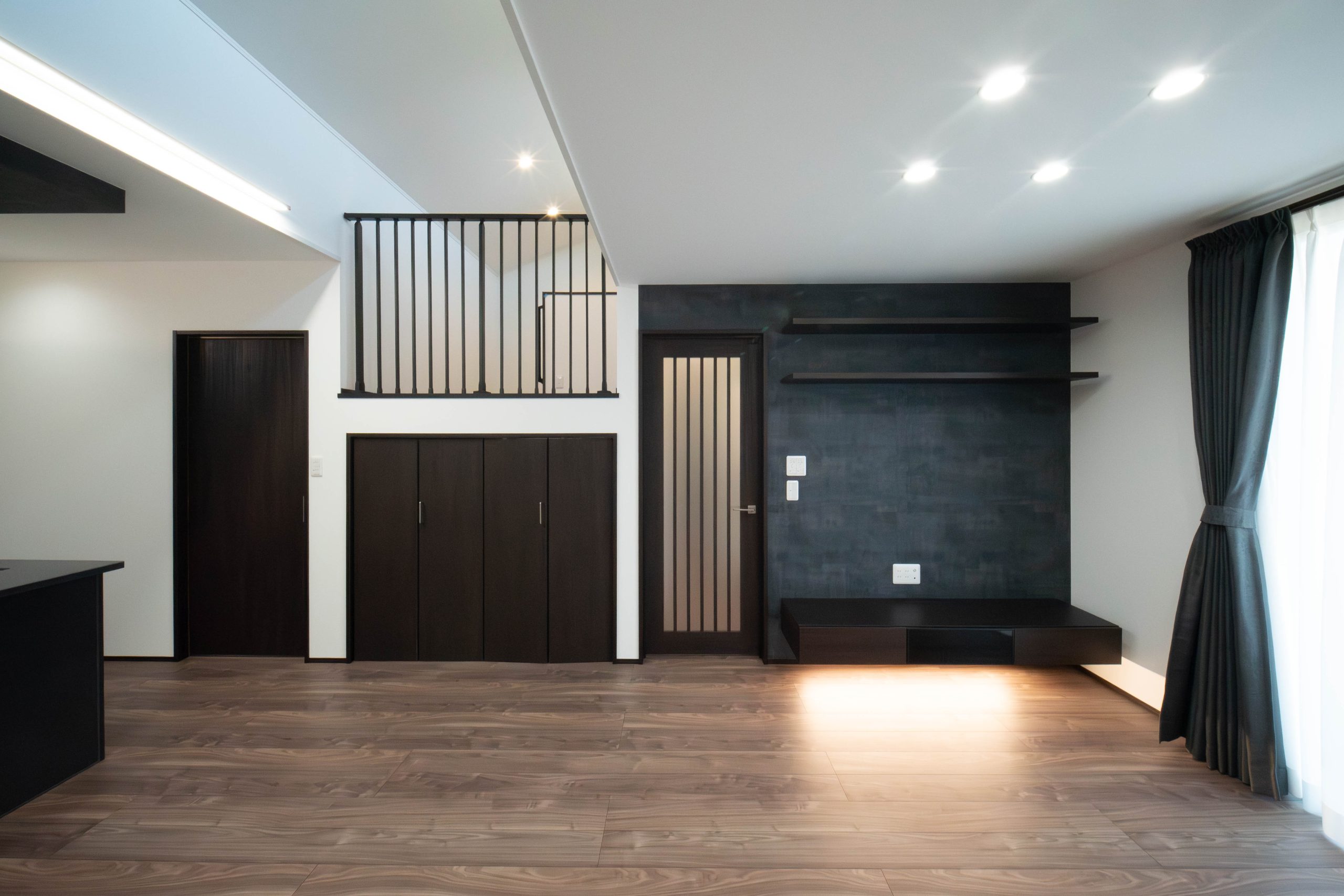 玄関入って向かってホール左側に位置するリビング。ソファを置いてくつろぎのスペースは平天井で落ち着きのある空間に。ロフトからの開口部や下部収納もあって遊び心も満載。