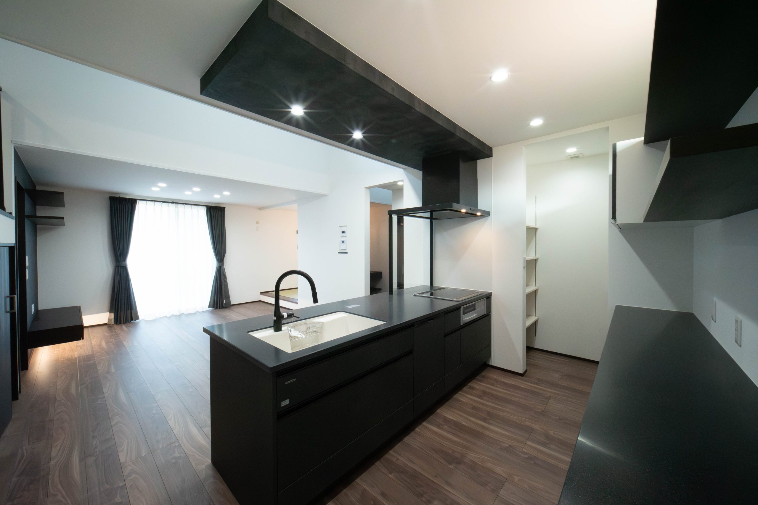 ホールと寝室の二方向から通じるダイニングとキッチン。食洗器・IHクッキングヒーター付で機能性バツグンのシステムキッチン。背面の食器棚は使い勝手の良いカウンタータイプに棚を造作。キッチン奥には食料品やキッチン用品の買い置きができるパントリーも完備。