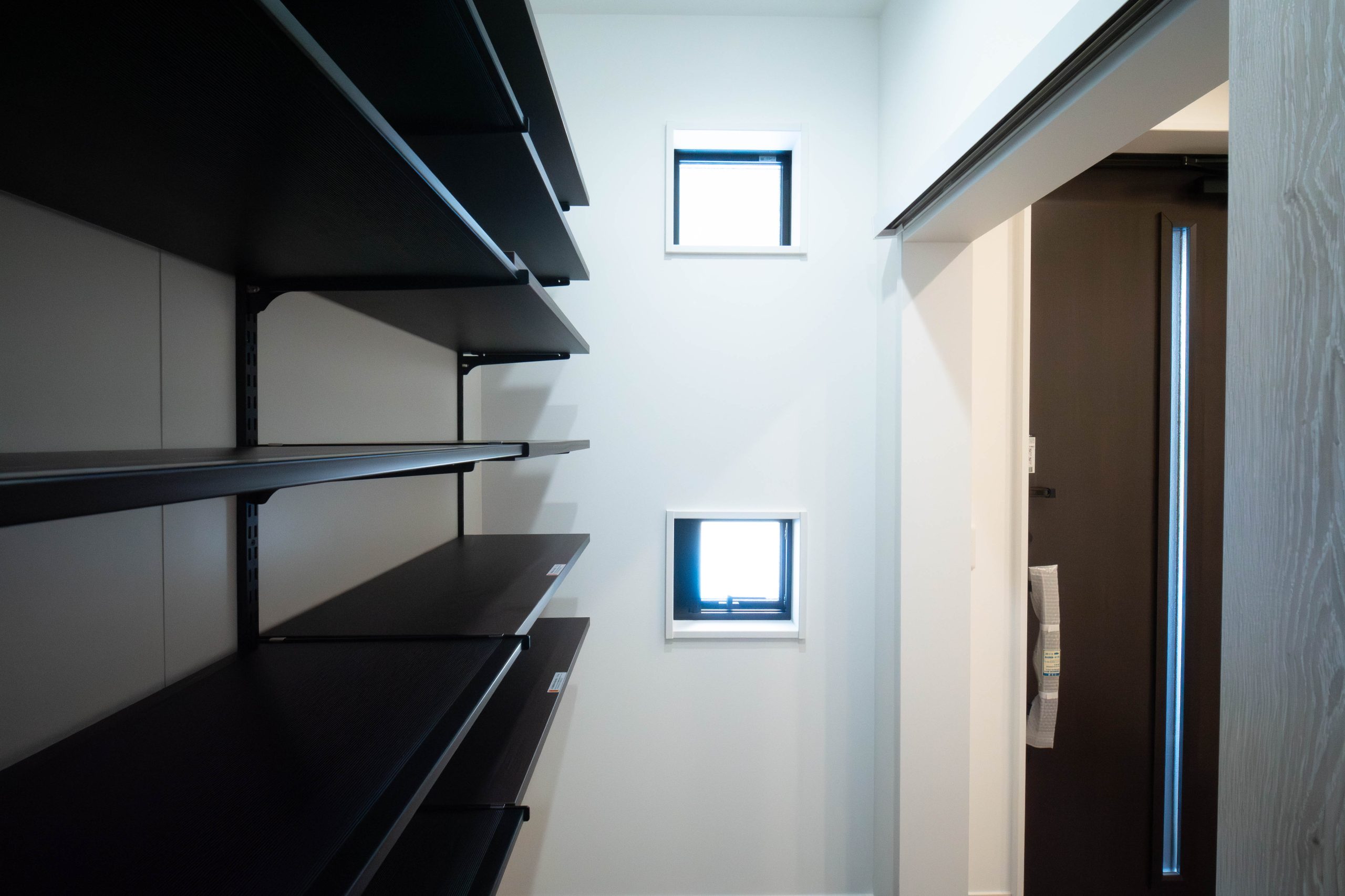 大容量のシューズクローク。可動式の棚で靴の形やお好みの位置で固定可能。玄関とは引戸で開け閉めが可能。お客様の目線も遮れます。外観デザインとも兼ねた、開け閉め可能な明り取り窓で、空気も暗くこもりがちなクロークも、採光・換気もできて気持ちの良い玄関を維持できます。