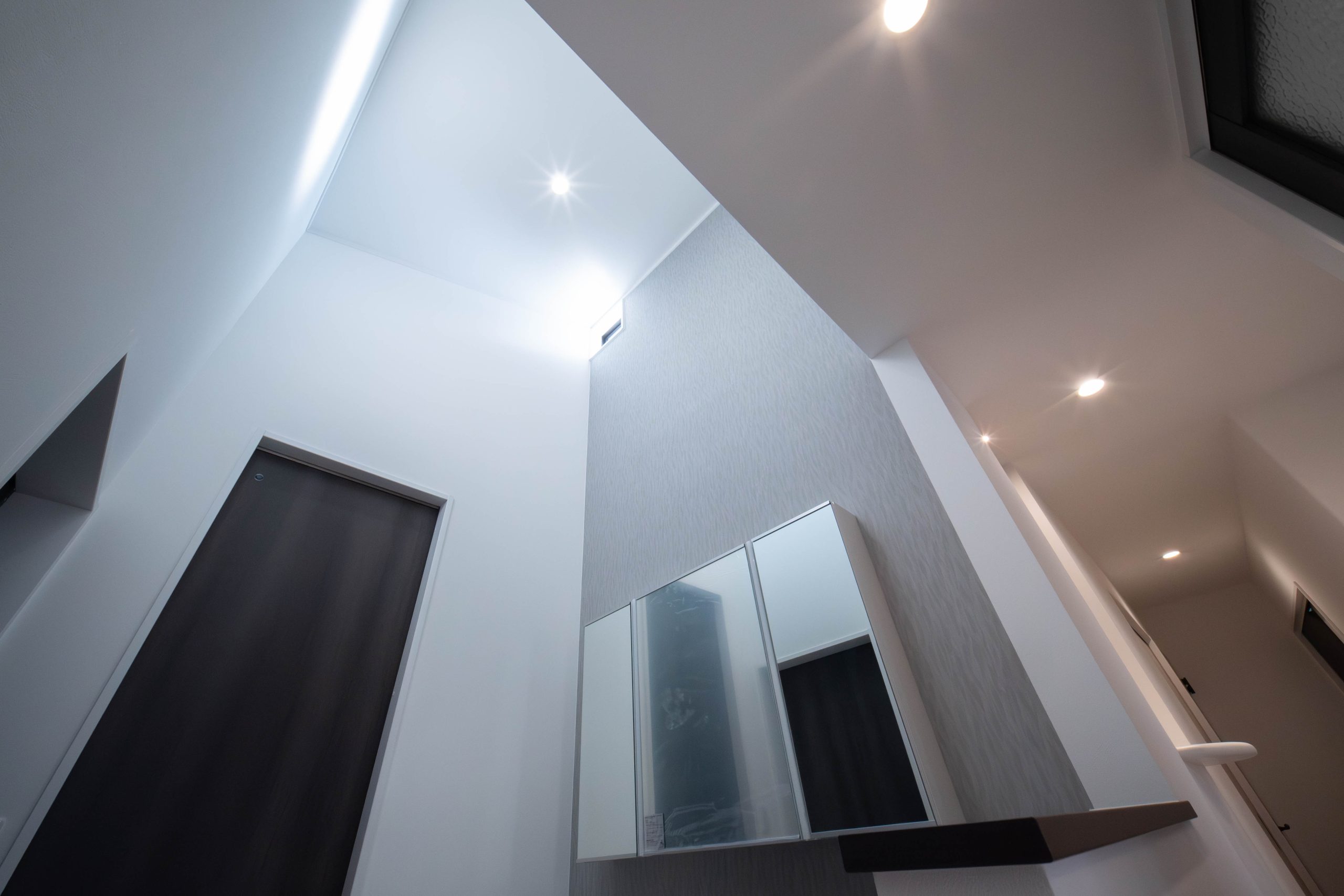 通路横に設けられた、幅広の造作洗面化粧台。屋根型を活かした吹き抜けの贅沢な空間と明り取り窓から注ぐ光がもたらす特別感。おっくうな毎朝も気分よくスタートできそう。