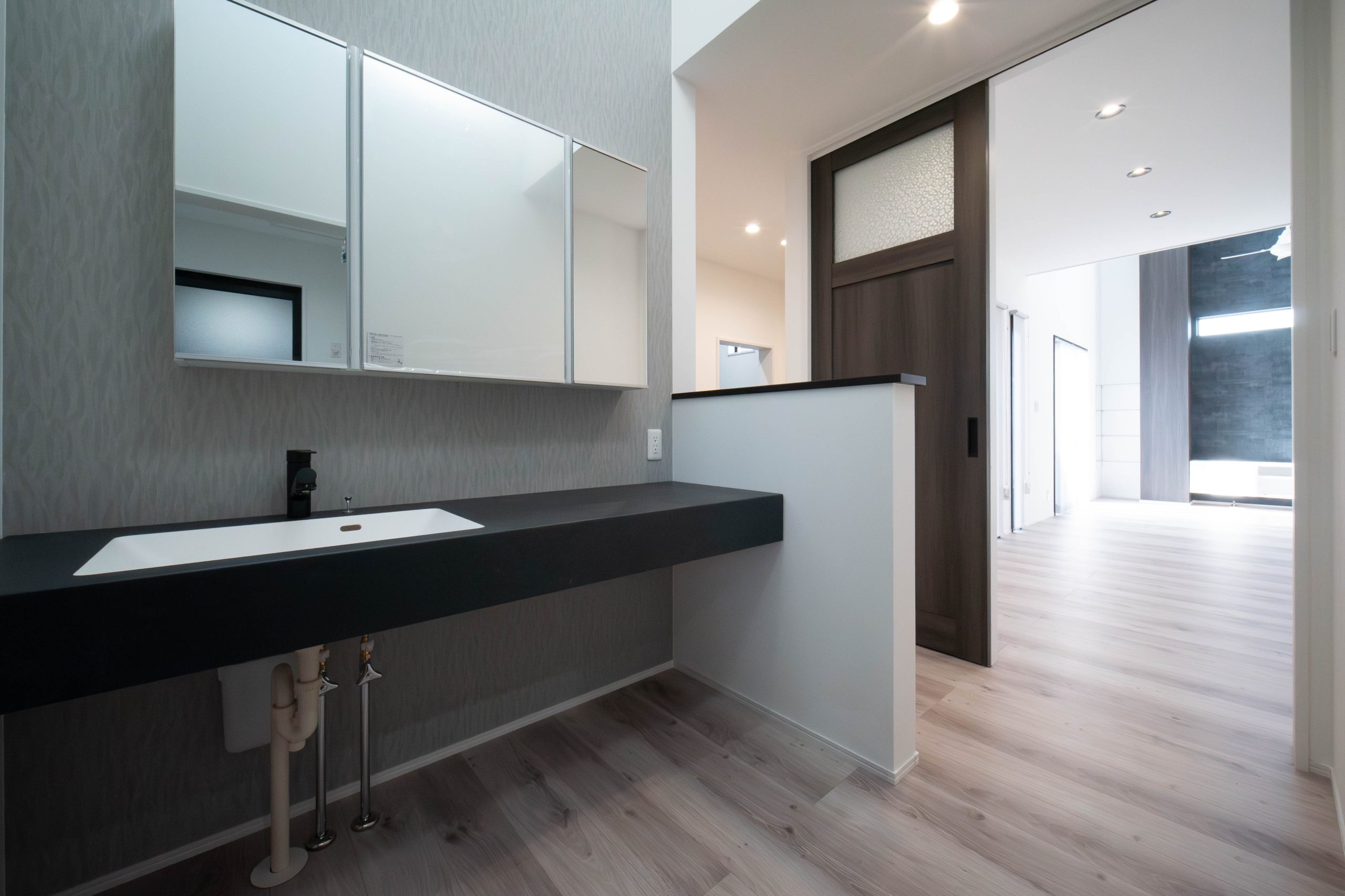 トイレ・脱衣所・LDKの三方からアクセス可能な位置に洗面化粧台を造作。幅広の天板にシンクと三面鏡で、込み合う朝の身支度も時間とスペースを家族でシェア。