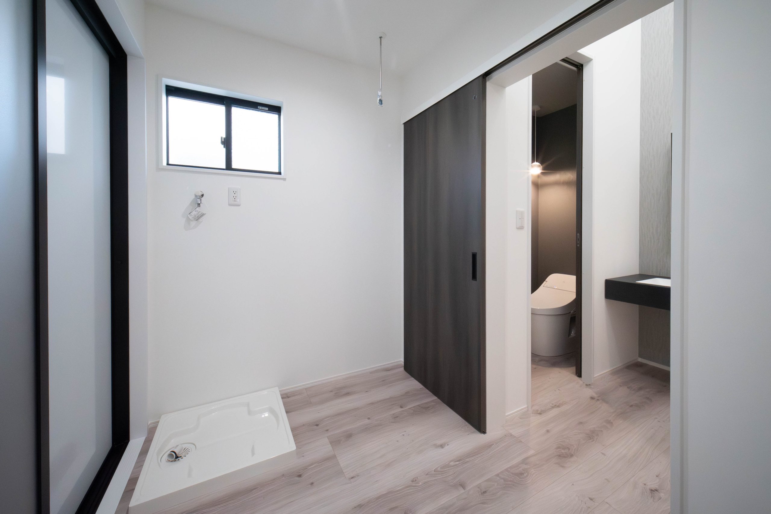 浴室へと通じる脱衣所は、洗面所とパントリーの二方向からアクセス可能。その隣にはアンティーク感のあるお洒落なペンダントライトとクロスで落ち着いた雰囲気のトイレ。水廻りを集中させた使い勝手の良い動線が特徴。