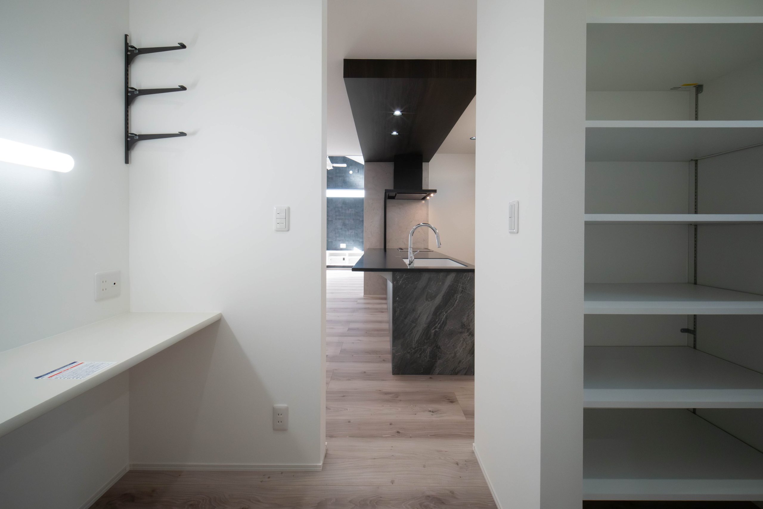 脱衣所からキッチン方面へ出ると家事スペースとパントリー。棚・カウンター付の家事スペースは奥様専用?子供達のスタディスペース?それともご主人の趣味部屋?と使い勝手イロイロ夢が広がります。パントリーは日常の買い置きや、かさばる掃除道具も、まとめて収納できる大容量の収納力を確保。