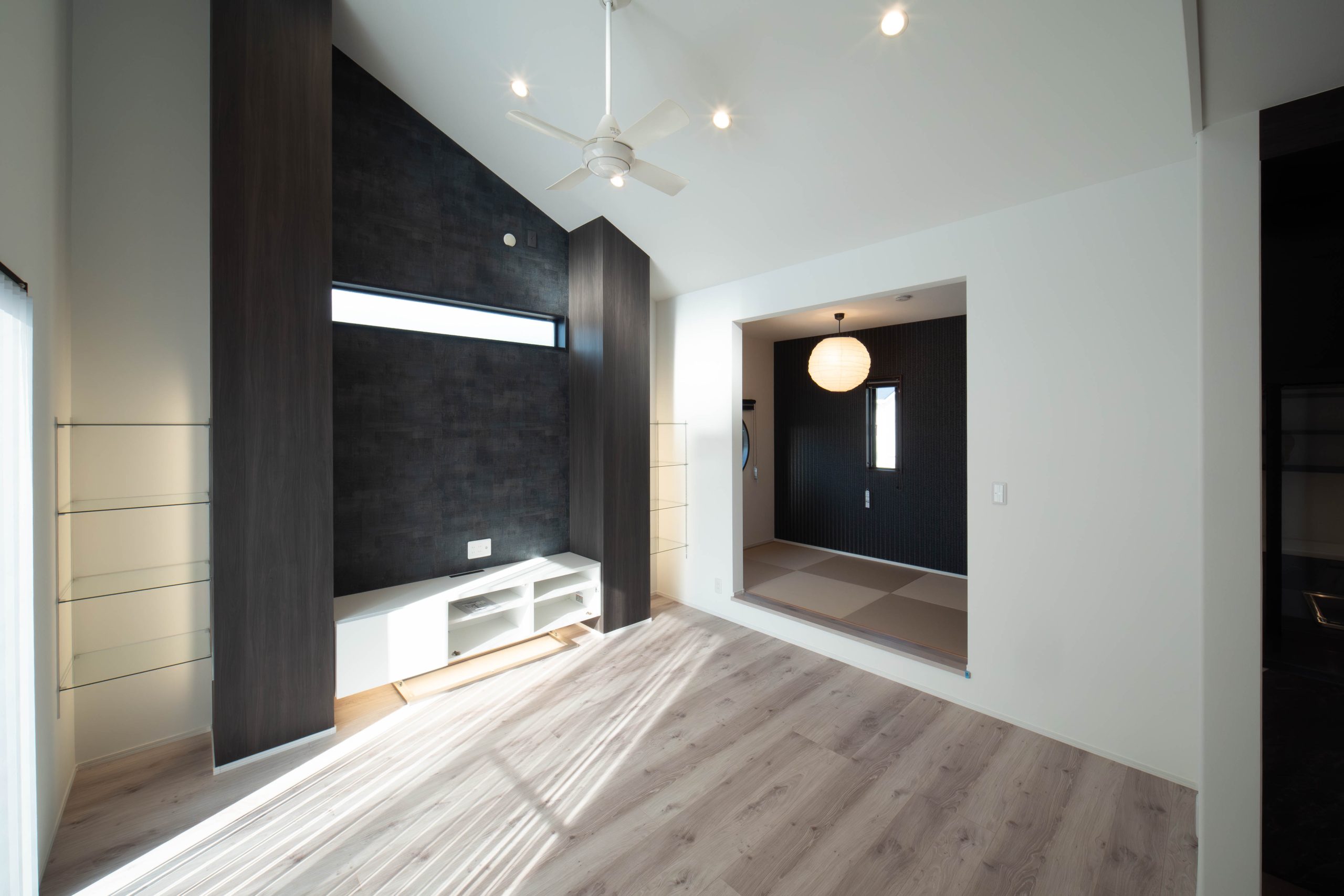 片流れ屋根をいかした吹き抜けのリビング。大型テレビの使用を措定したTVボードと飾り棚を設置。吹き抜けの贅沢な空間と明り取り窓から注ぐ注ぐ光がもたらす特別感。間接照明とアクセントクロスで高級感もUP。くつろぎの空間を演出します。