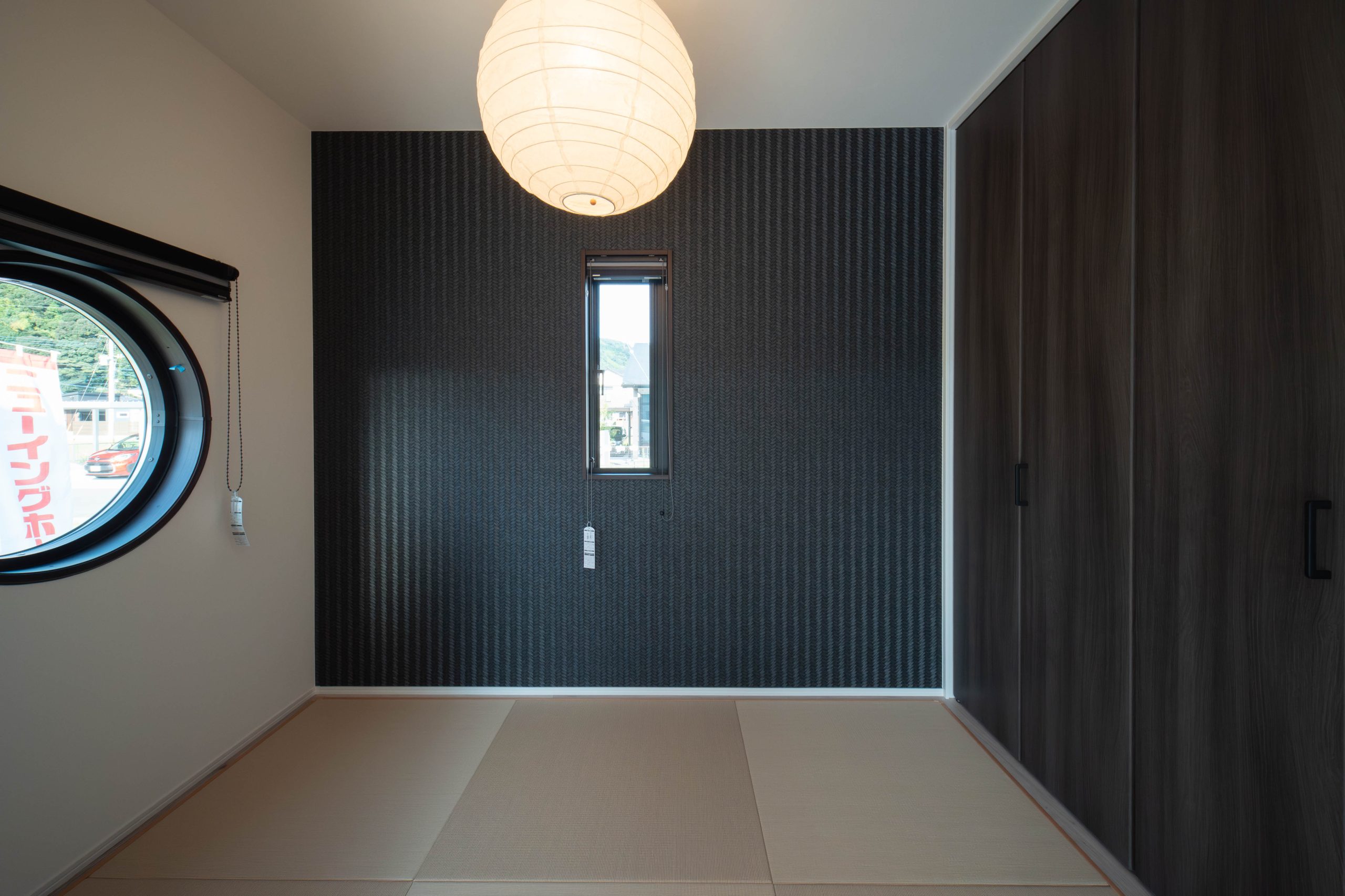 丸型の窓から外を望める和室は、収納もしっかりと完備した3畳の畳コーナー。急なお客様やお泊まりに対応。