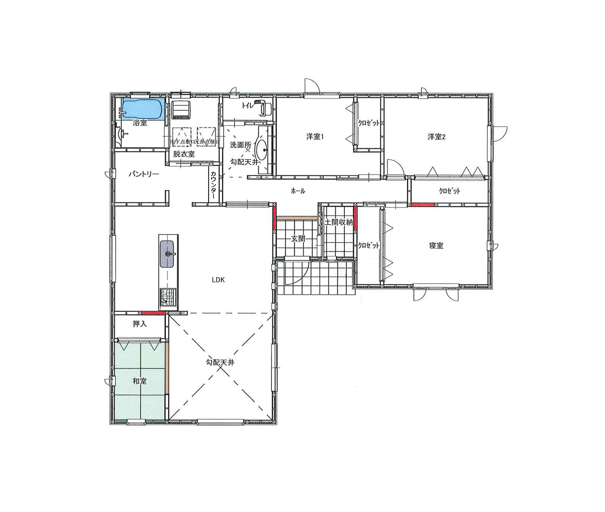 家族共有ゾーンとプライベートゾーン、水廻りがしっかりとすみ分けられた平屋建て。屋根型を活かして、いたる所に設けられた吹き抜けが特別感・開放感を演出!